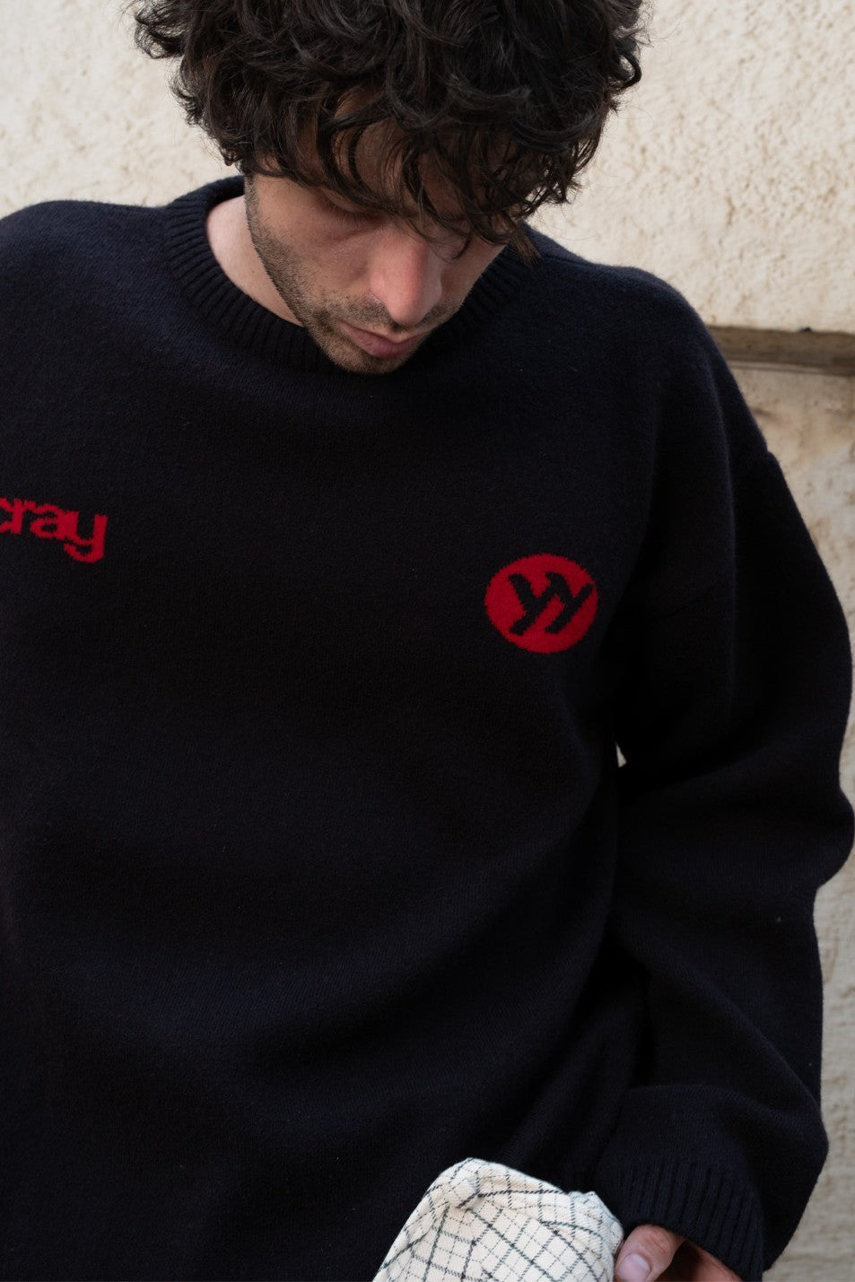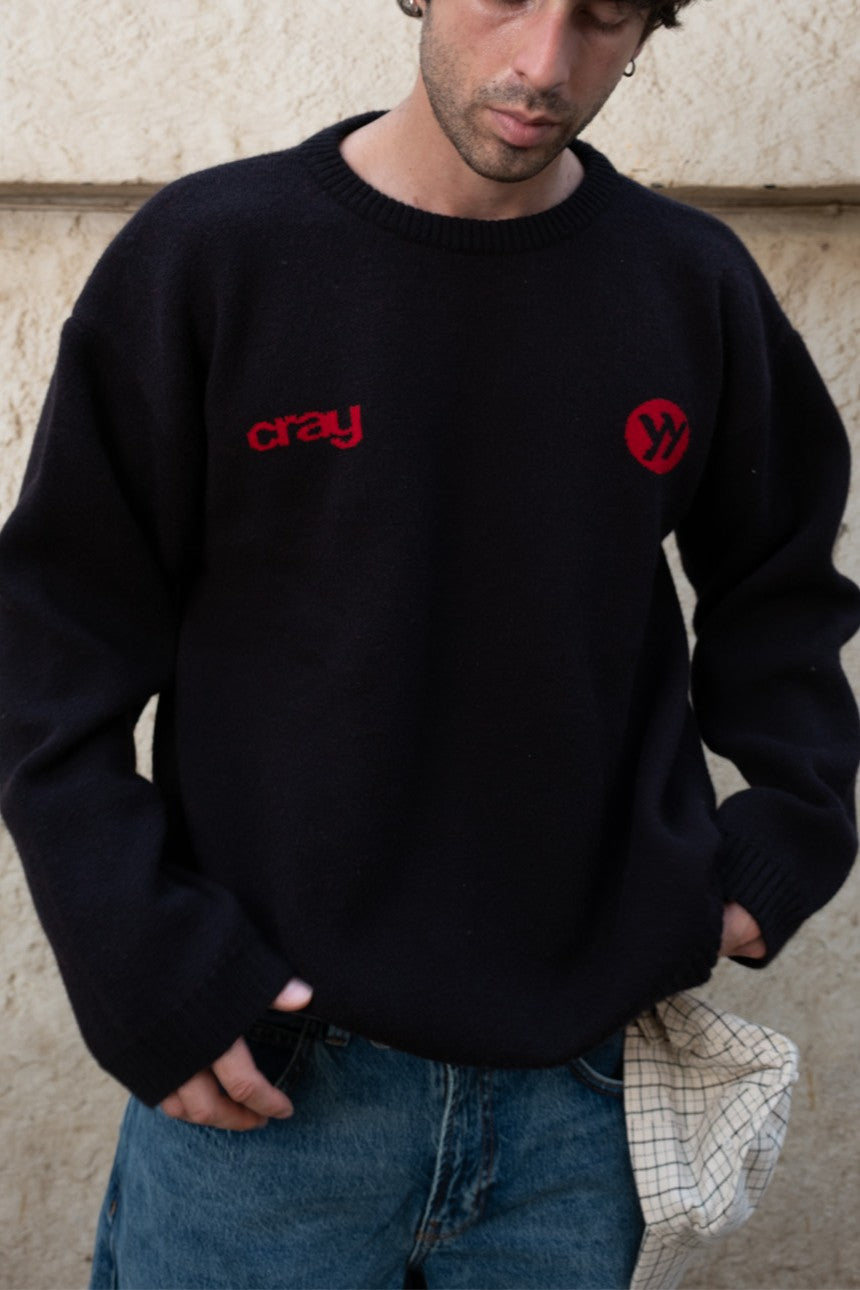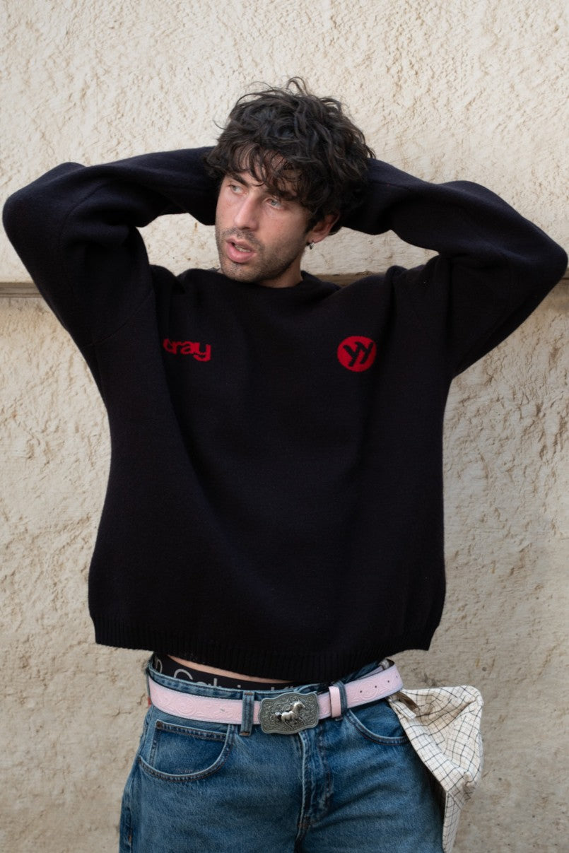 This is our newest black knit featuring red text “cray” and a circular “yy” logo on the left side of the chest. It has a relaxed fit with a ribbed crew neckline, cuffs, and hem for a comfortable finish. The knit sits slightly loose on the body, making it easy to style across looks. The standout detail is the large red “H” on the back, creating a strong contrast against the black base. Designed with clean lines and minimal detailing, it carries a balanced mix of casual and sharp.